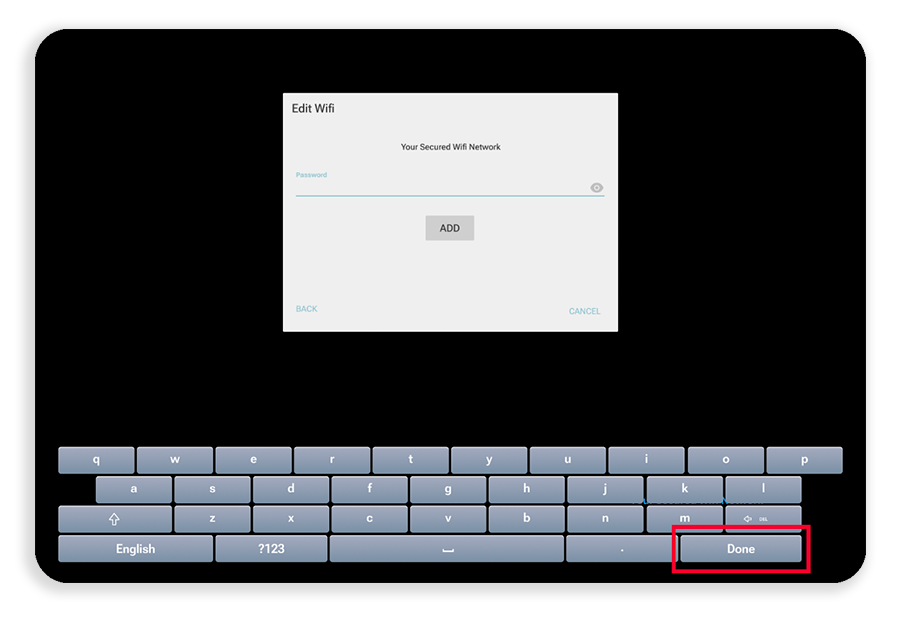 If a password has changed, or connecting to a new Wifi network, enter the password into the field using the arrow keys on the remote to select characters on the on screen keyboard, then select Done in the bottom right to hide the keyboard.