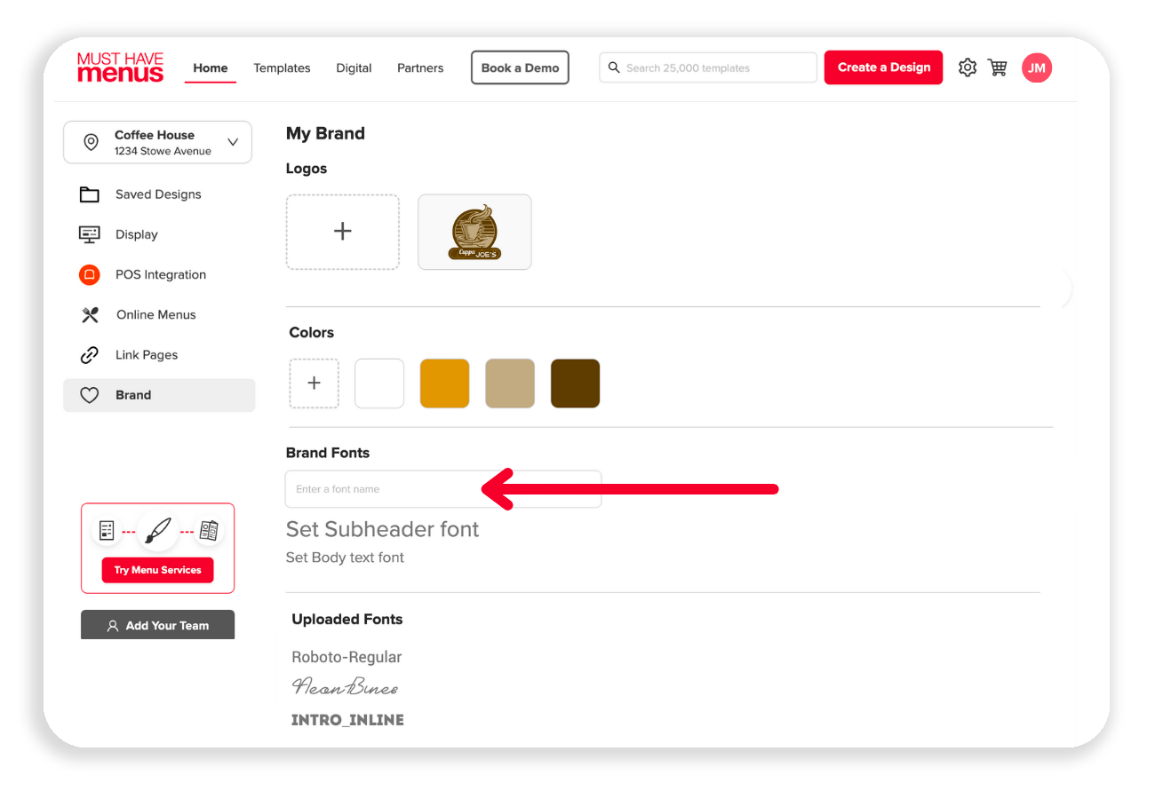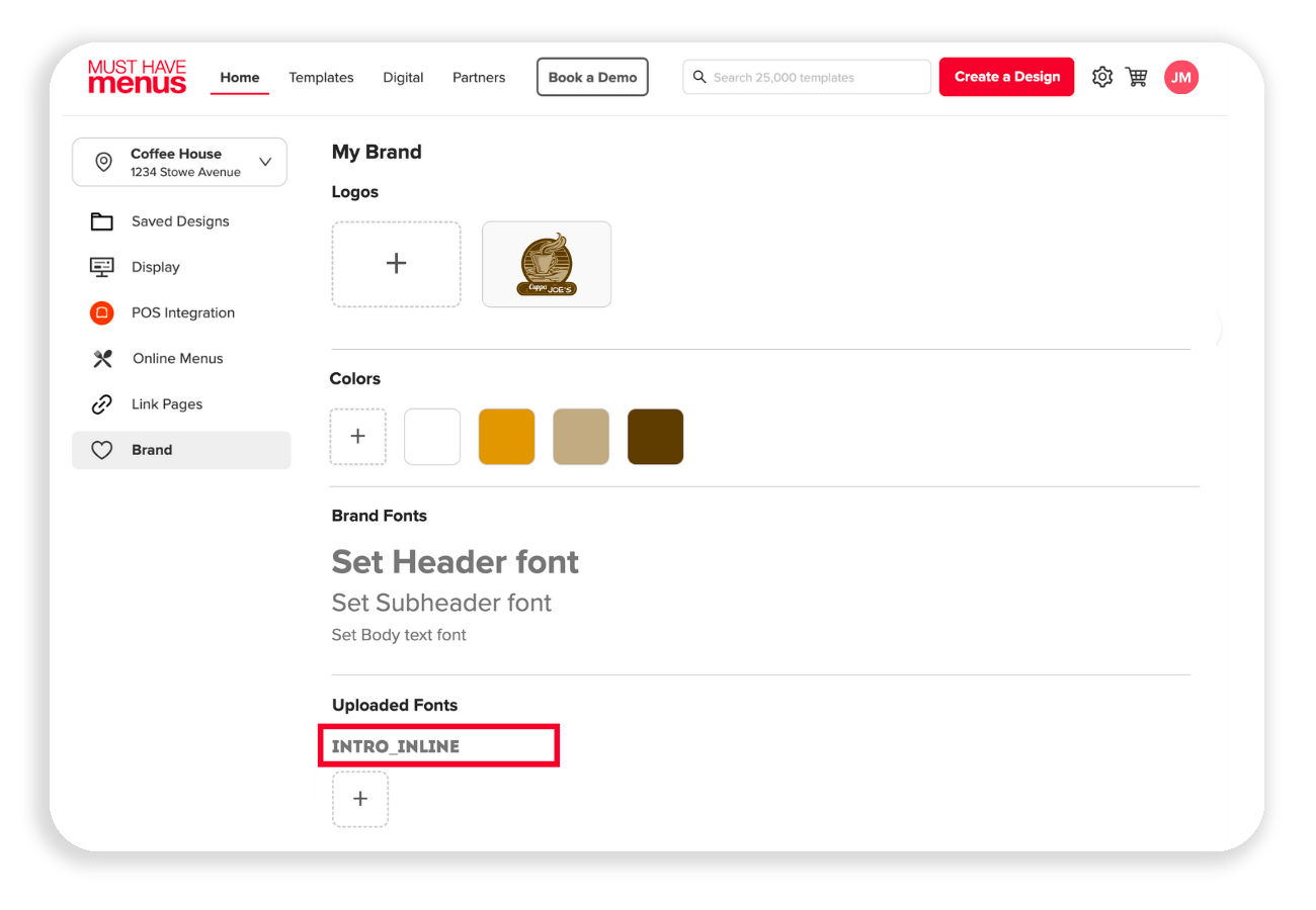 Learn how to upload a logo within Brand. The Brand feature makes it easy to organize logos, brand colors, and favorite fonts all in one place. Upload a Logo From the Home page, select Brand from the left panel. Once on My Brand, select the + tile ...